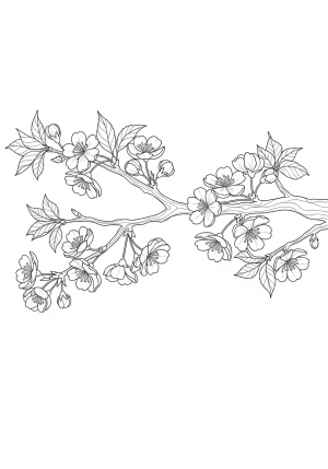 An intricate cherry blossom tree branch with delicate flowers and leaves stretching across the page.