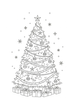 A festive Christmas tree decorated with ornaments, stars, and tinsel, surrounded by wrapped presents and snowflakes in a detailed line drawing.