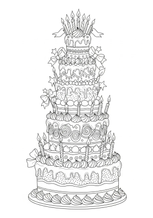 A detailed illustration of a tall, multi-layered birthday cake adorned with elaborate icing swirls, candles, and festive decorations