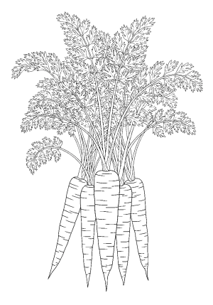 A detailed illustration of a cluster of carrots growing in a garden with their leafy tops extending outward