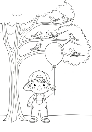 A cheerful little person wearing a baseball cap and overalls, holding a balloon and standing in front of a tree with birds perched on its branches