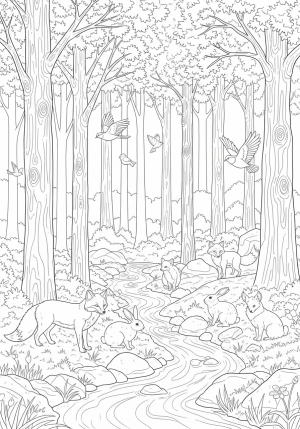 A detailed scene of a peaceful forest with tall trees, a flowing stream, and various woodland animals like foxes, rabbits, and birds, all depicted in intricate line art