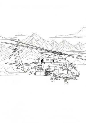 A detailed outline of a large military helicopter flying over a mountain range with clouds in the background