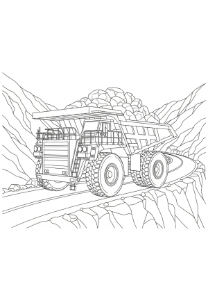 A large dump truck carrying a load of rocks on a rugged mountain road with detailed machinery and wheels