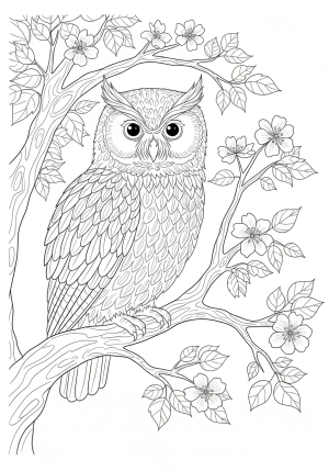 A wise owl perched on a tree branch surrounded by detailed leaves and flowers, with intricate feathers and a serene expression.
