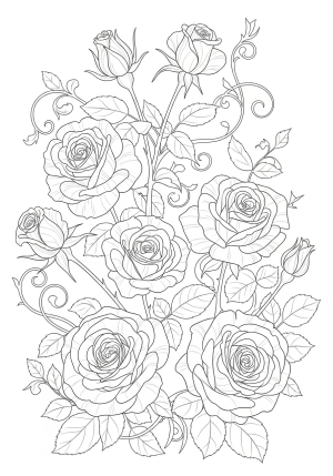 A detailed illustration of a blooming rose garden with various roses in different stages of bloom and intricate vine patterns weaving through the flowers