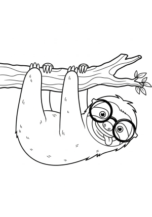 A silly sloth hanging upside down from a tree branch wearing oversized glasses and a goofy grin