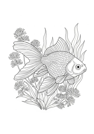 A detailed illustration of a graceful goldfish swimming among aquatic plants with flowing fins and intricate scales