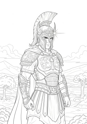 A detailed illustration of a warrior wearing a majestic helmet of salvation with intricate patterns and a shining crest, standing confidently in a biblical landscape