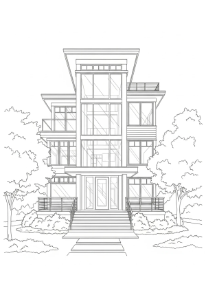 A tall modern house with large windows and a front porch, set amid trees and bushes, in a simple line art style