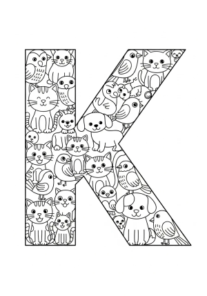 A playful scene featuring a big letter K shaped out of a variety of animals such as cats and birds, designed with bold outlines and fun details.
