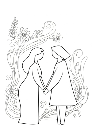 A heartfelt scene of two abstract figures holding hands surrounded by delicate floral patterns and swirling lines.