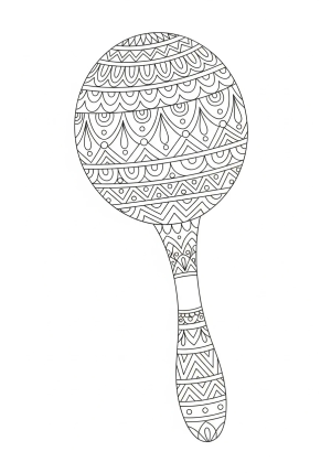 A detailed line drawing of a traditional maraca with intricate patterns and decorative elements.