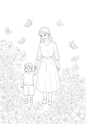 A loving mother holding her child's hand while walking through a garden filled with flowers and butterflies