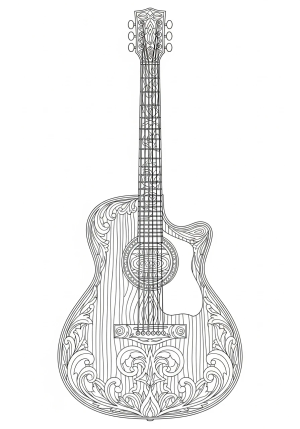 A detailed line drawing of a classic acoustic guitar with intricate wood grain patterns and decorative elements