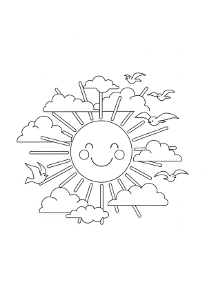 A cheerful smiling sun with rays shining, surrounded by fluffy clouds and birds flying.