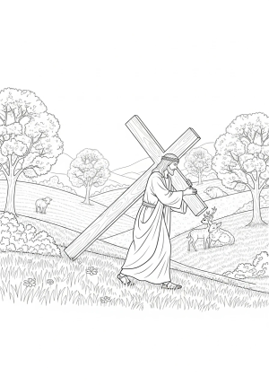 A serene scene of Jesus carrying a cross through a peaceful landscape with rolling hills, accompanied by blooming trees and gentle animals