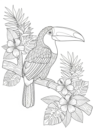 A detailed illustration of a toucan perched on a tropical branch with lush leaves and flowers in the background