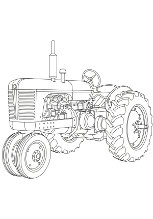 A detailed outline of a classic farm tractor with large rear wheels and intricate engine parts.