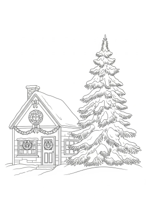 A vintage Christmas scene featuring a cozy cottage decorated with wreaths and a classic snow-covered evergreen tree, with intricate details and nostalgic charm
